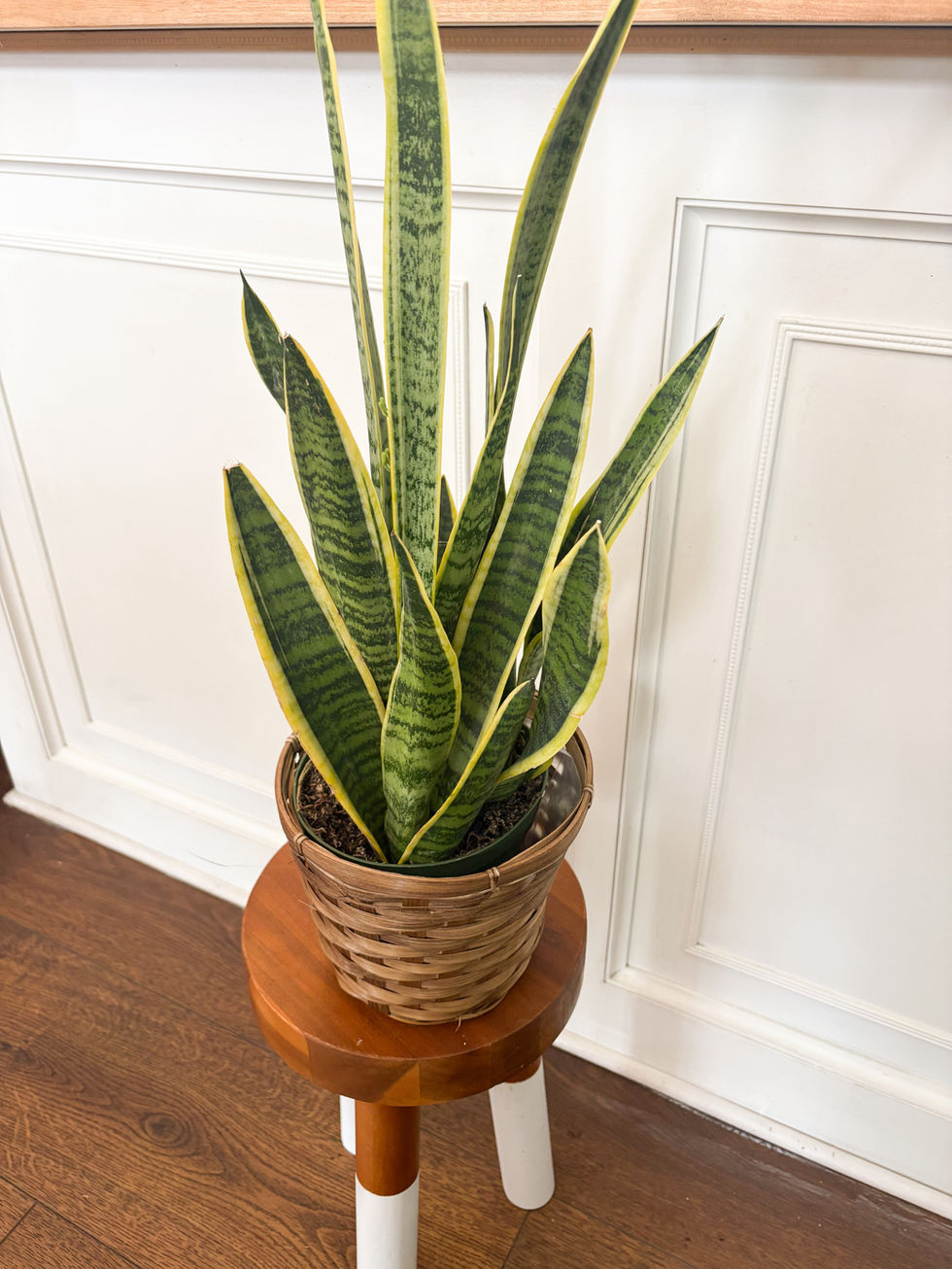 Bold, beautiful, and virtually indestructible. This striking Snake Plant features dramatic upright leaves with deep green banding and bright yellow edges — and comes potted in a charming woven basket planter, ready to display. It thrives in low light, forgives missed waterings, and even purifies your air. The perfect plant for any home or office.