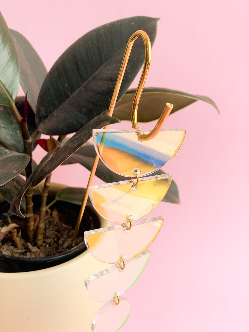 Accessorize your houseplants with plant jewelry! The perfect gift for any plant loving friend, or a way to have fun with your our of control plant collection. This plant pick is made of iridescent acrylic that reacts beautifully to sunlight and will cast rainbow filled reflections around the room throughout the day.